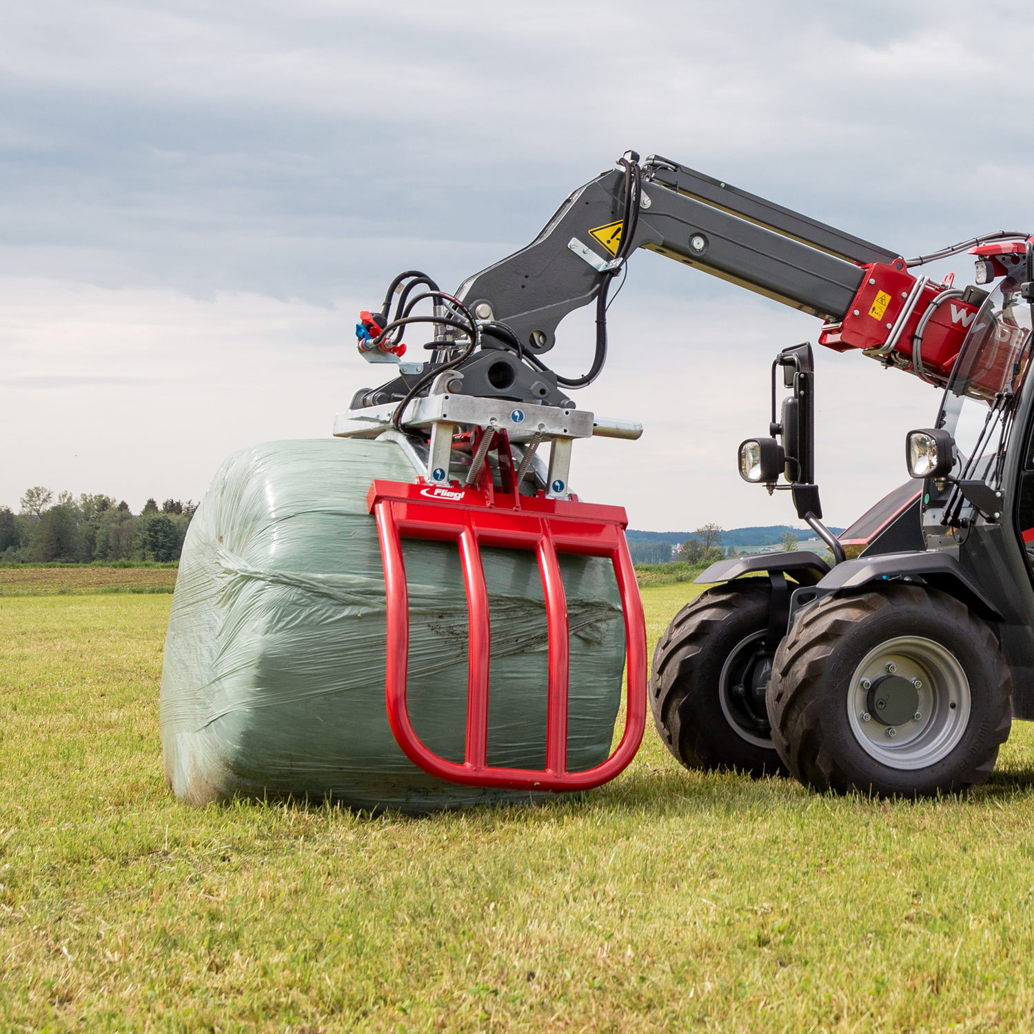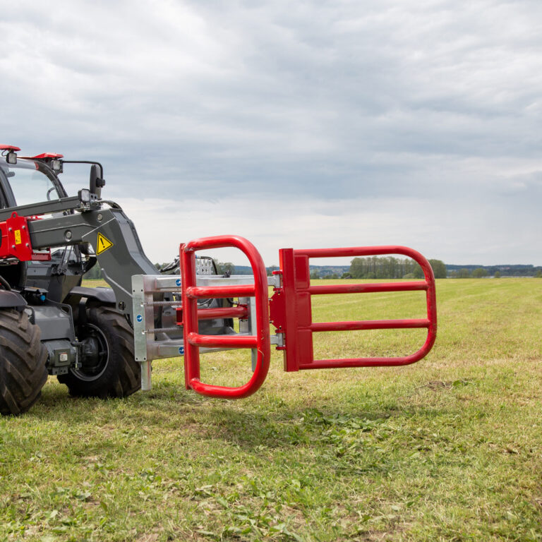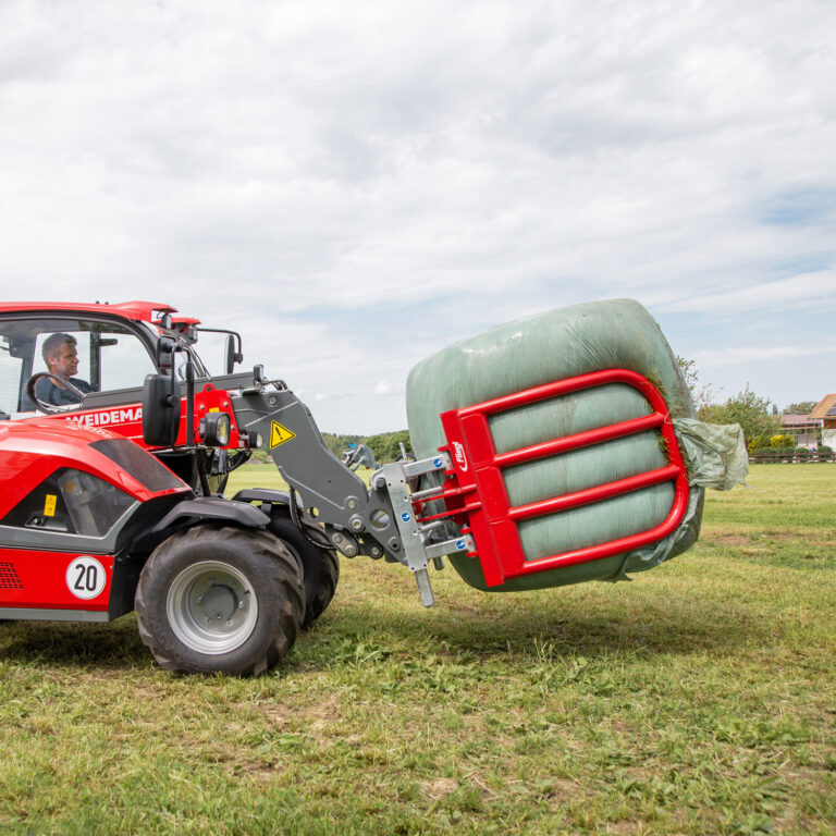 Die kompakte und schonende Bauform ermöglicht ein Laden und Stapeln von Rundballen, ohne sie zu beschädigen.